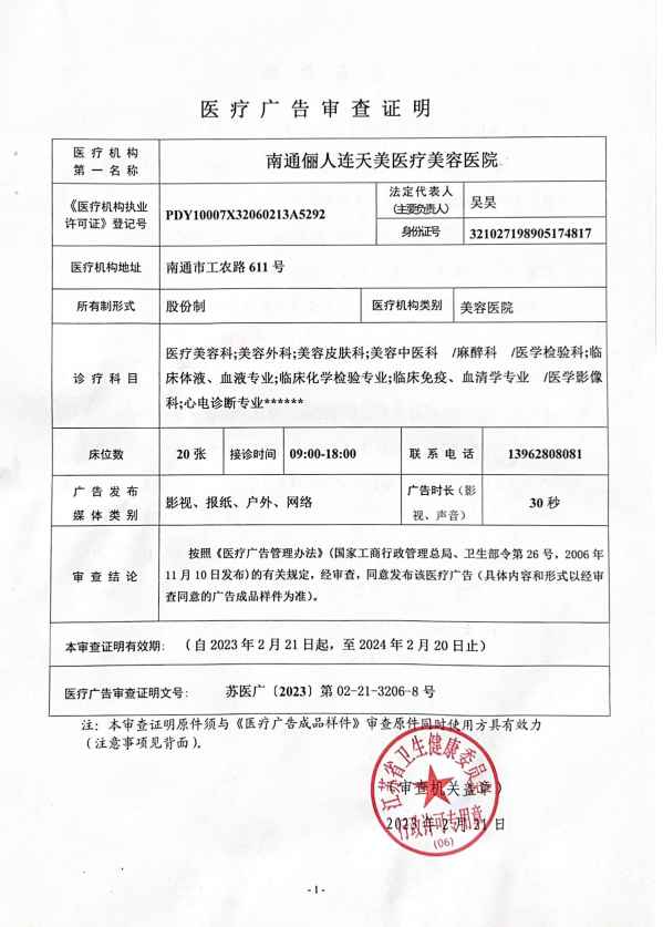 南通儷人連天美醫(yī)療美容醫(yī)院是與著名的醫(yī)療美容集團(tuán)合作建立的醫(yī)院,醫(yī)院提供高品質(zhì)的醫(yī)療美容服務(wù)。2008年,南通儷人連天美醫(yī)療美容醫(yī)院落戶南通,成為由南通衛(wèi)生局審批的專業(yè)醫(yī)療美容醫(yī)院。南通儷人連天美醫(yī)療美容醫(yī)院,特別設(shè)有專業(yè)的整形美容科、皮膚美容科和微創(chuàng)美容科三大科室,致力于為廣大求美者提供全方位的醫(yī)療美容服務(wù)。南通儷人連天美醫(yī)療美容醫(yī)院為求美者建立個人終生美麗檔案,一對一進(jìn)行細(xì)致服務(wù)。 11年來,南通儷人連天美醫(yī)療美容醫(yī)院,不斷引進(jìn)先進(jìn)設(shè)備,不斷完善醫(yī)美技術(shù),一批優(yōu)秀、專業(yè)而穩(wěn)定的醫(yī)生團(tuán)隊(duì),為無數(shù)求美者鑄就美麗夢想。
